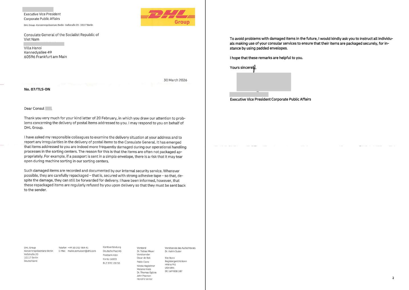 Tổng Lãnh sự quán đã có thư đề nghị Deustche Post và được phản hồi các biện pháp nhằm tăng cường phối hợp sử dụng tốt hơn dịch vụ bưu điện – thư kèm theo.