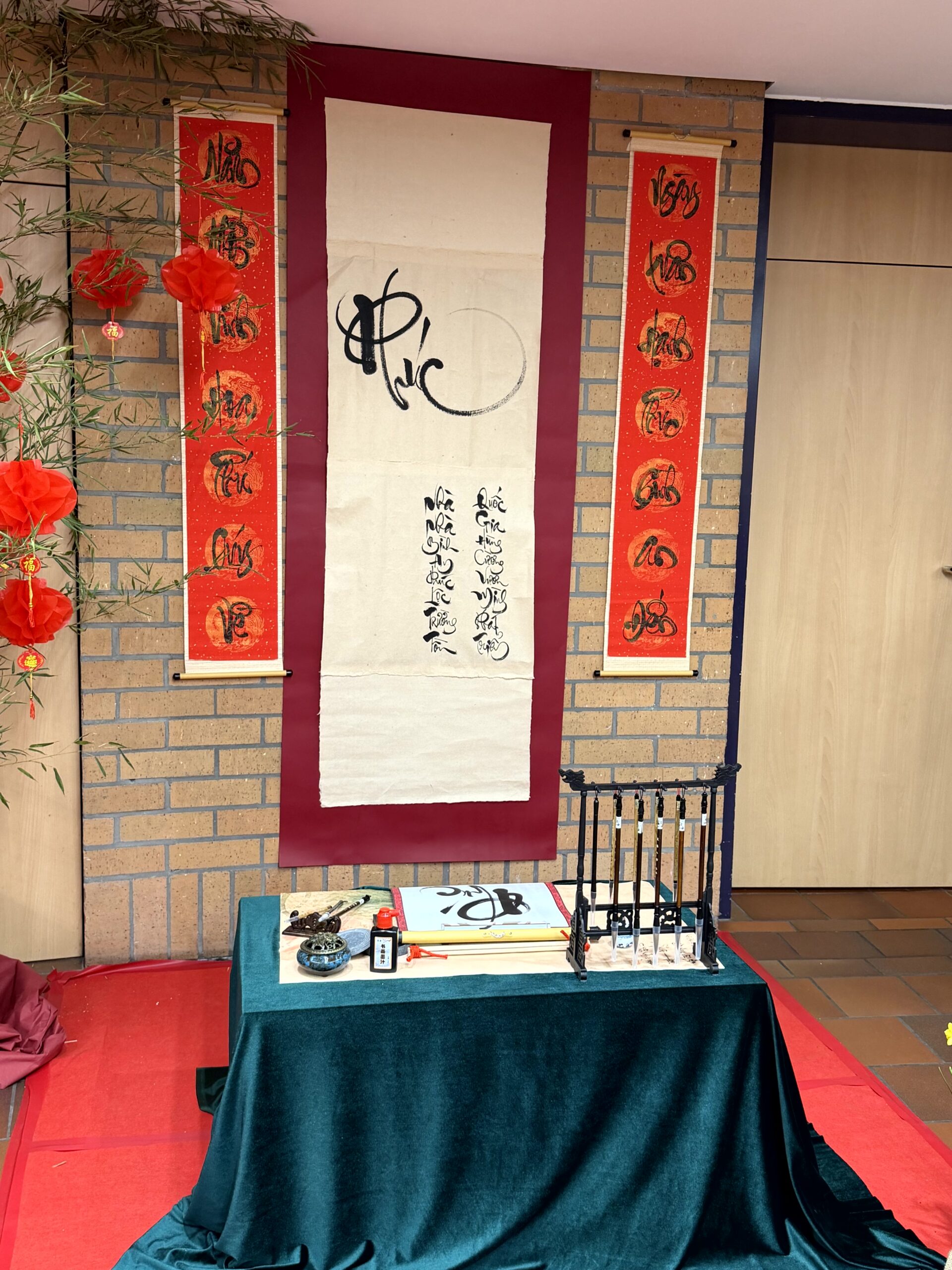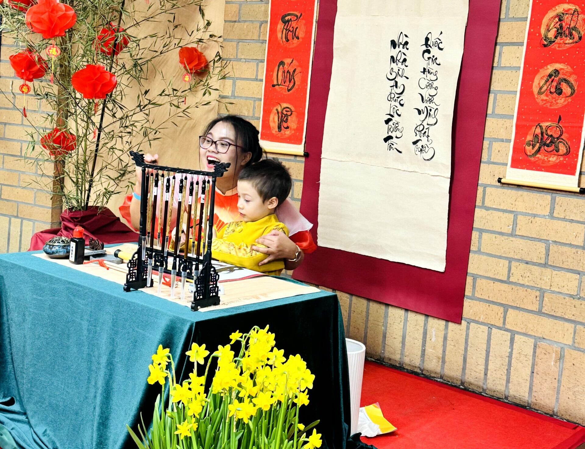 Không gian chương trình Tết được tổ chức đậm sắc xuân với cành đào rực rỡ, câu đối đỏ, góc ông đồ cho chữ đầu năm, khu trải nghiệm gói bánh chưng và nhiều gian hàng ẩm thực truyền thống mang hương vị quê nhà.